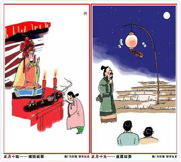 正月十四,临水娘娘诞辰,又称“顺天圣母”。是拯救难产妇女的神仙。 正月十五,夜照田蚕(神)。观颜色判断一年的丰歉,后演化为元宵节观灯。