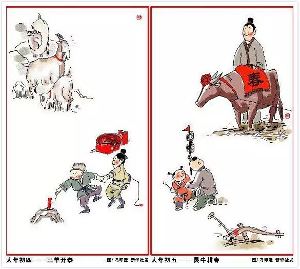 大年初四,三羊开泰。灶王爷要查户口,恭迎灶神回民间。 大年初五,艮牛耕春。五路接财神,东西南北中,财富五路通。